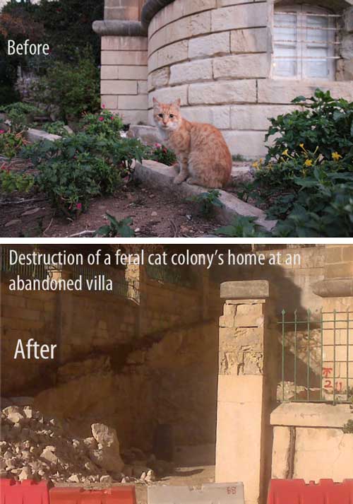 The abandoned villa featured in the video above that was the home of a feral cat colony managed by Richard is now being redeveloped. Their home has been destroyed. We are responsible for feral cats and the developers had a duty to deal with them humanely, I argue. Here is a picture of theb vill; before and after. They were not taken at exactly the same spot but you can see what is happening: