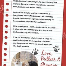Butters and Grayson are two feral cats in North Carolina. They recently wrote to Santa asking for a forever barn home. The two are bonded and will need to stay together. Butters and Grayson entered the barn cat program back in March. The program is a project offered by no-kill SPCA of Wake County. The …