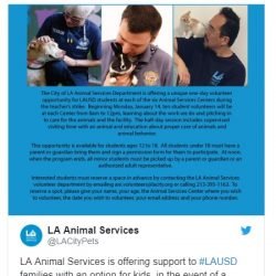 The Los Angeles Unified School District is on strike for improved student conditions, better resources and more pay. The strike left many students bored in class. The ones who didn’t play hooky, that is. Los Angeles Animal Services came up with a plan for students who needed a place to go this week and …