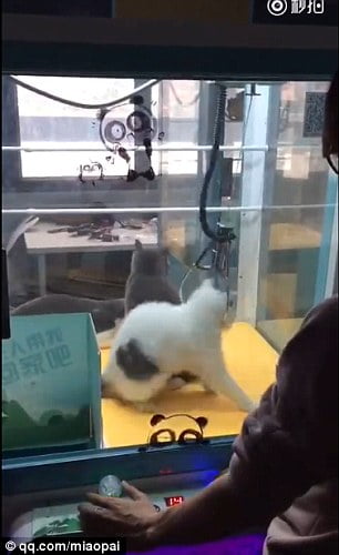 Three cats in the claw machine perspex cage waiting to be grabbed by a claw operated by a player outside.